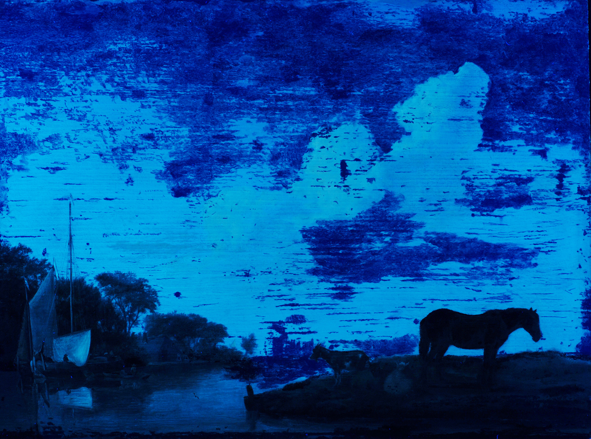 In der blau erscheinenden UV-Aufnahme erschließen sich die an der Tafel notwendig gewordenen Retuschen als dunkle Flächen und Linien.