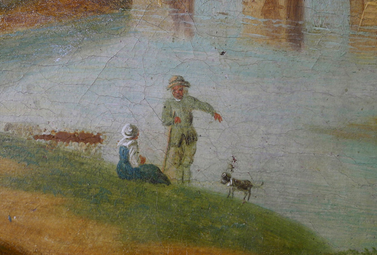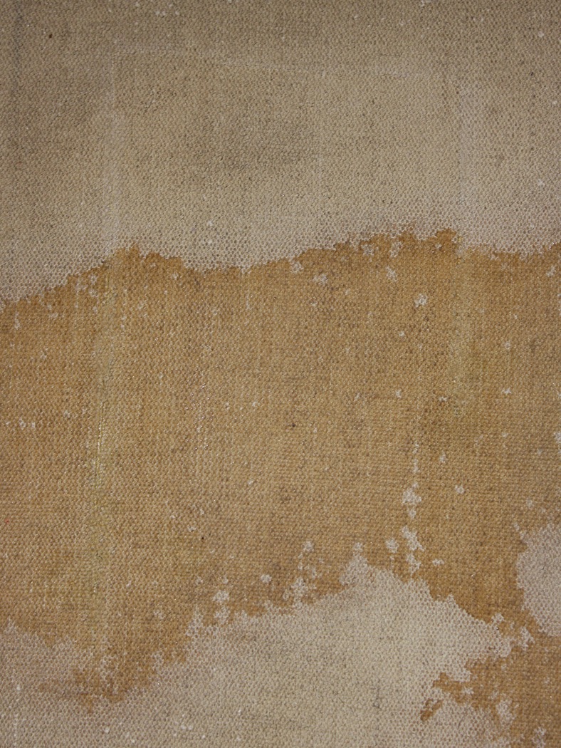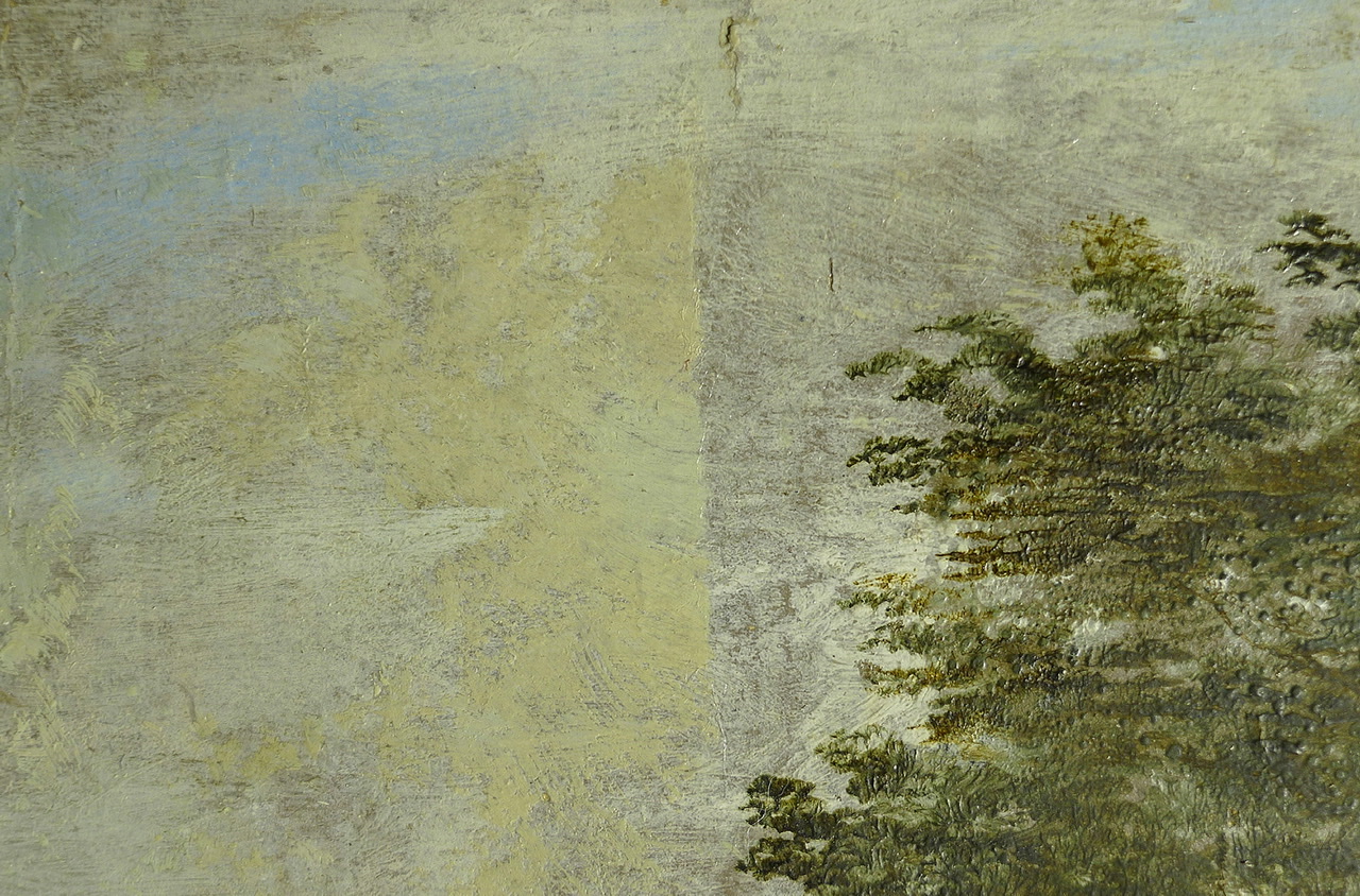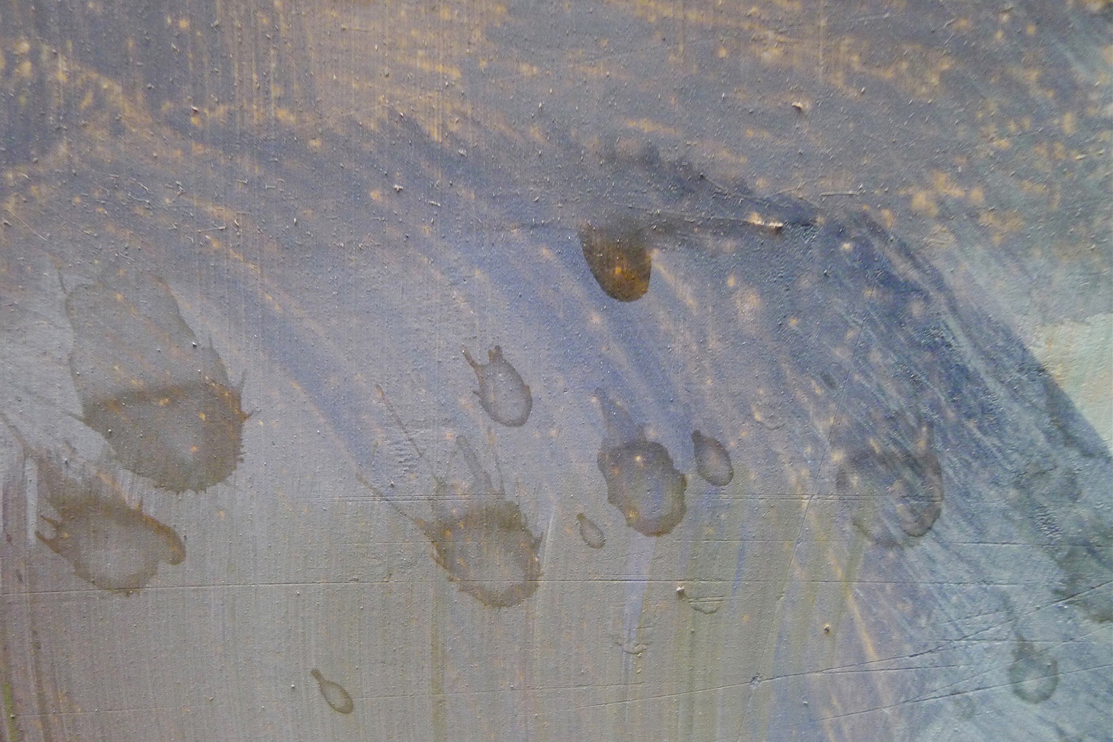 Die Flecken gehen auf einen Unfall mit Cola zurück, übrig geblieben ist im Prinzip der getrocknete Zucker auf der Gemäldeoberfläche. Mit Hilfe von etwas Feuchtigkeit konnten die Colaflecken von der Oberfläche gut entfernt werden. Die zurückgeblieben Ausfärbungen waren geringfügig und wurden mit Pastellfarben retuschiert.