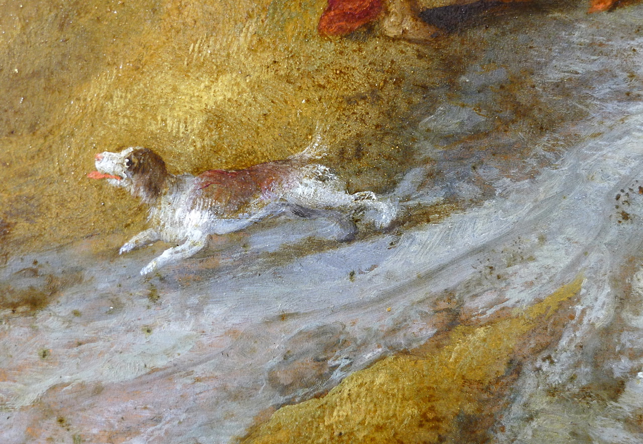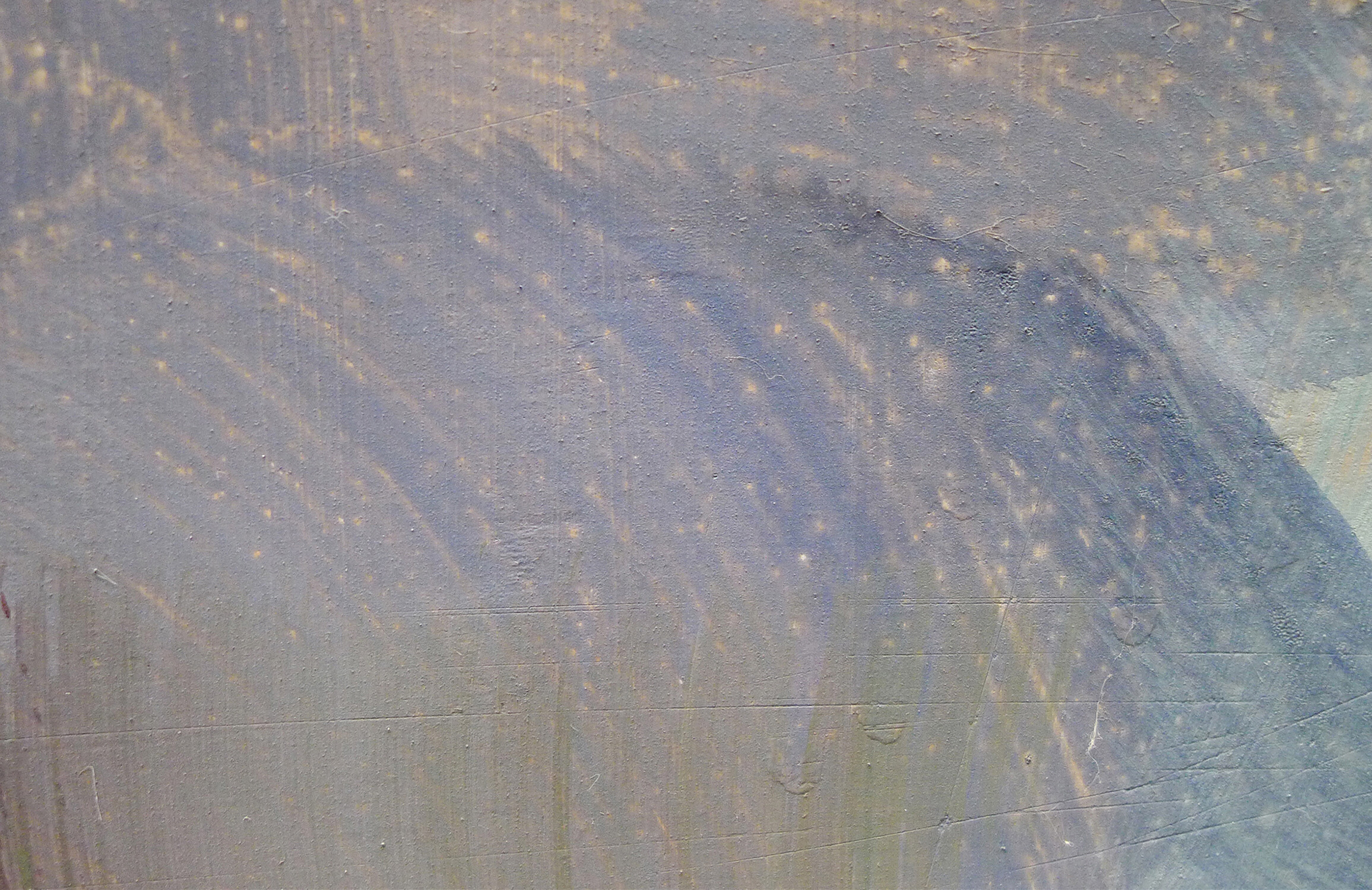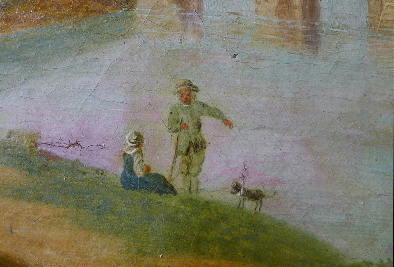 Die Flecken gehen auf einen Unfall mit Cola zurück, übrig geblieben ist im Prinzip der getrocknete Zucker auf der Gemäldeoberfläche. Mit Hilfe von etwas Feuchtigkeit konnten die Colaflecken von der Oberfläche gut entfernt werden. Die zurückgeblieben Ausfärbungen waren geringfügig und wurden mit Pastellfarben retuschiert.
