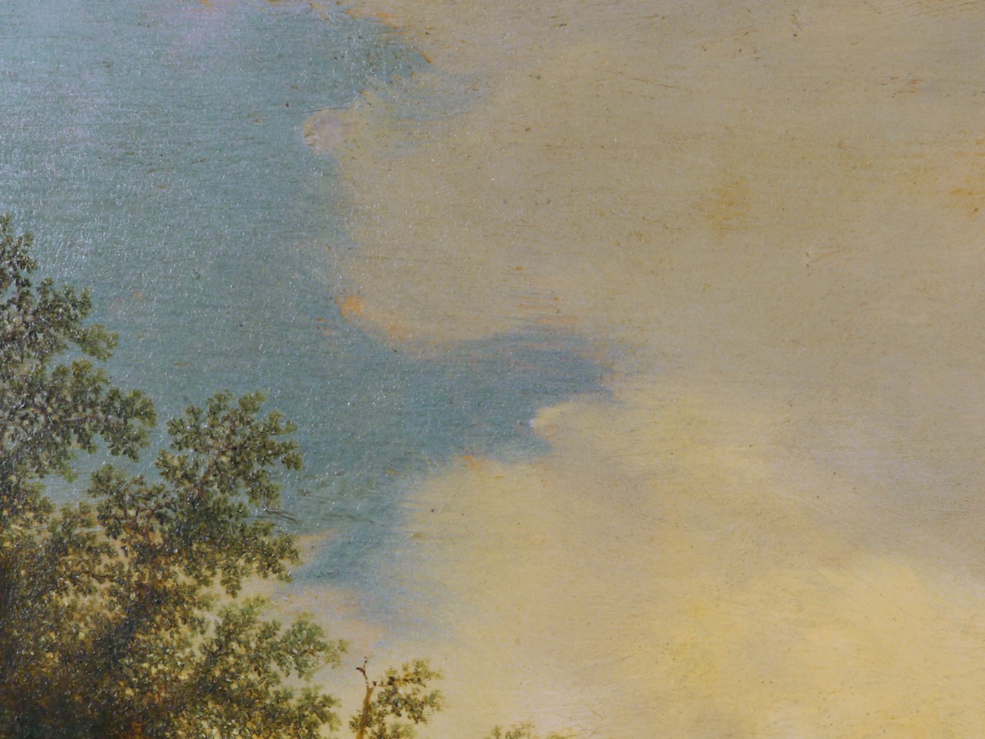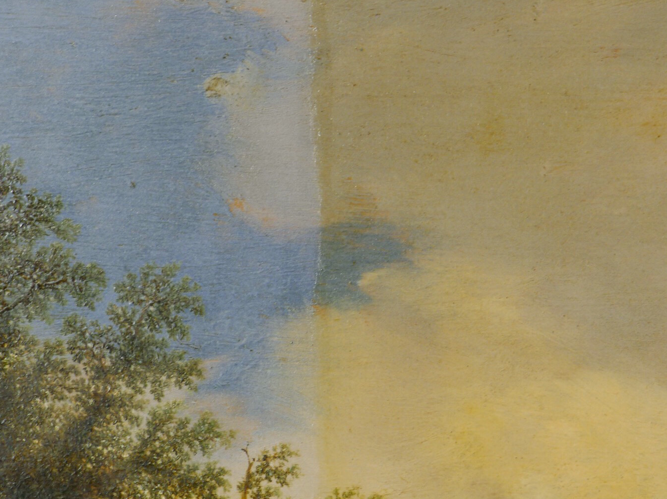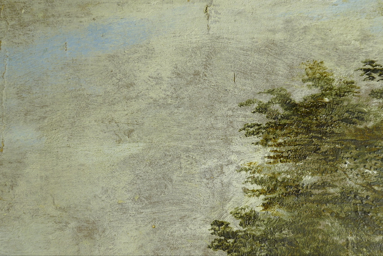 Die transparente Malerei des Himmels wird der Anlass für die Übermalung (linke Bildhälfte) gewesen sein. Sie ist mittlerweile vergilbt und hebt sich sehr von der originalen Oberfläche ab. Mit jedem entfernten Zentimeter der Übermalung wird originale Bildfläche zurück gewonnen.
