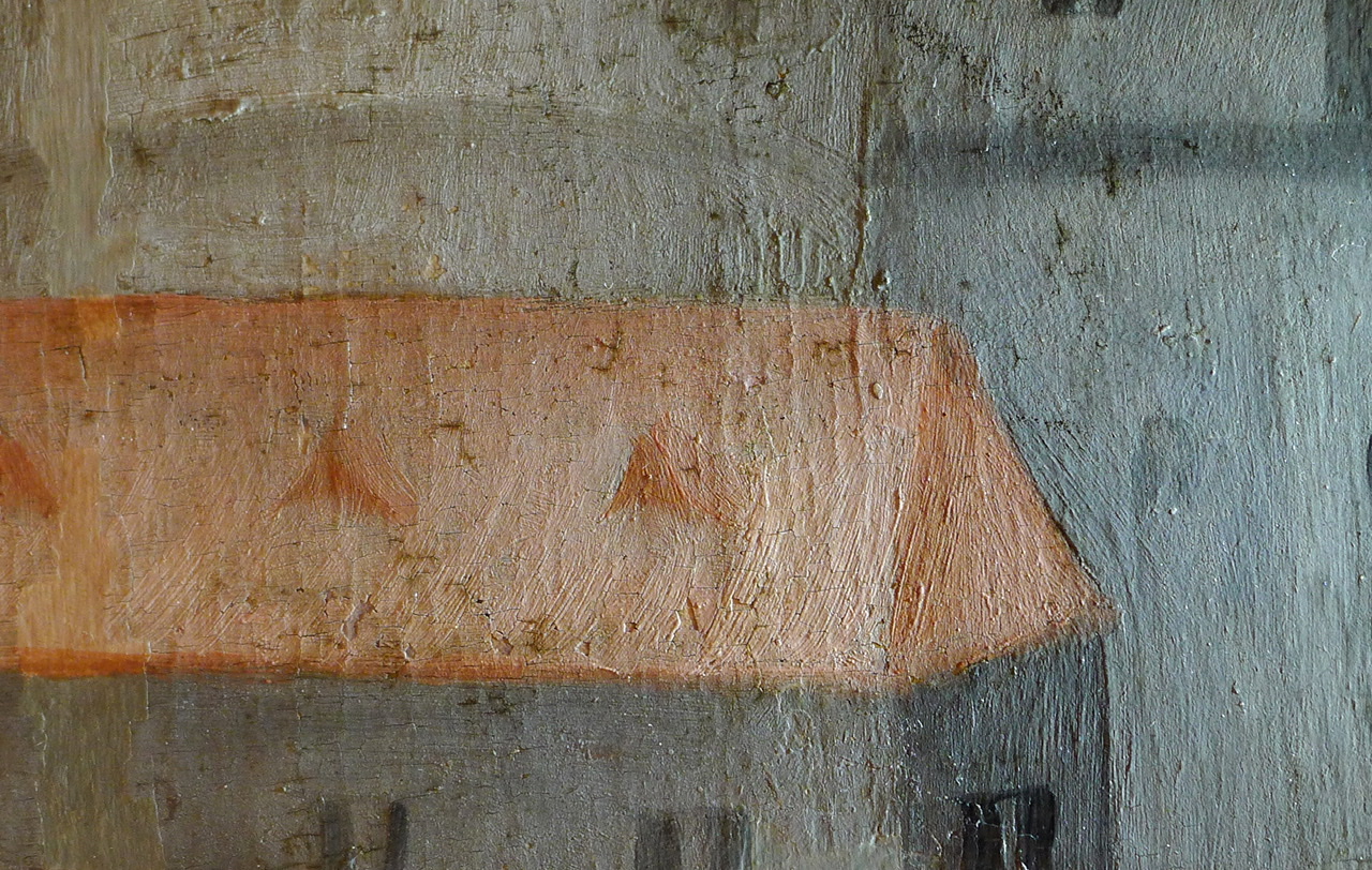Diese Gemäldetafel wurde in der Vergangenheit bereits restauriert. Der Zustand der Tafel ist sehr gut, jedoch hat sich die alte Retusche (rosa) im Laufe der Jahre farblich verändert und fällt heraus. Mit Hilfe von speziell für Konservatoren entwickelten Farben wird die Retusche optisch verbessert.