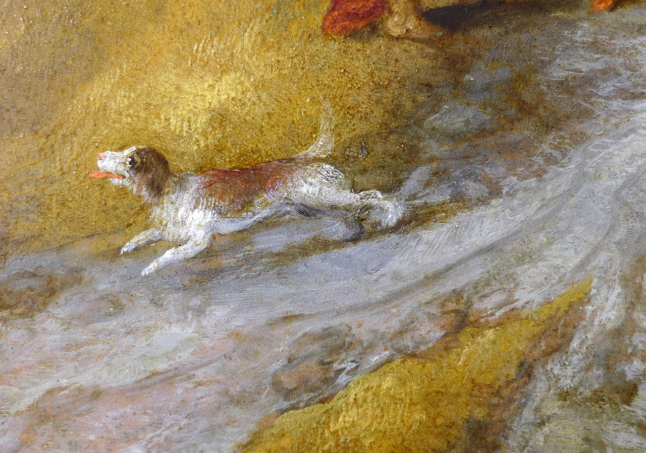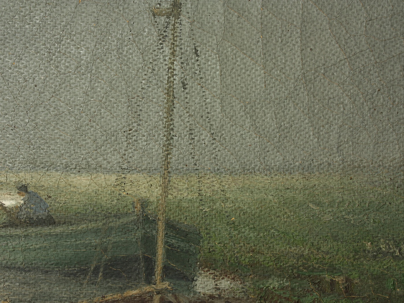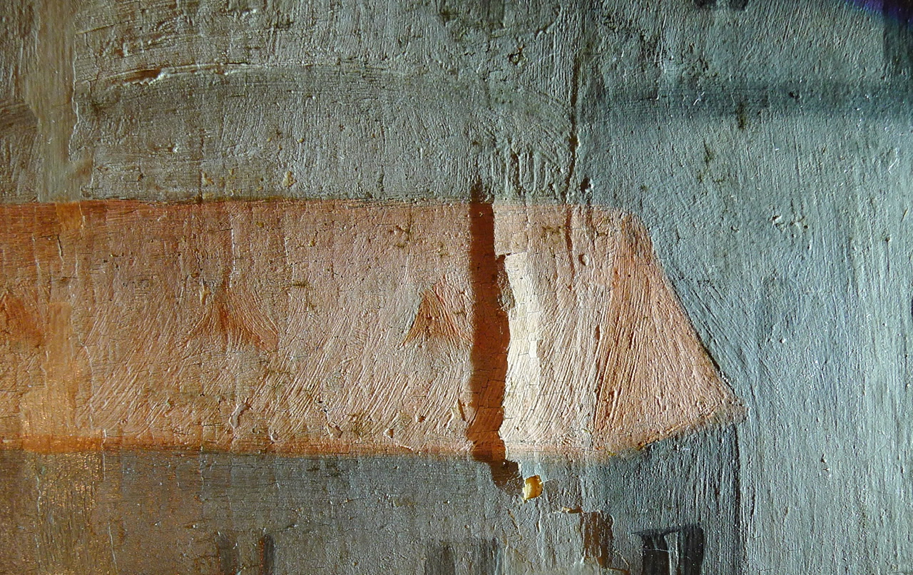 Links der sitzenden Figur tritt nun eine rotbraune Wachskittung in Erscheinung, die eine kleine Leinwandverletzung überdeckt. Diese wird in der weiteren Bearbeitung des Gemäldes entfernt.