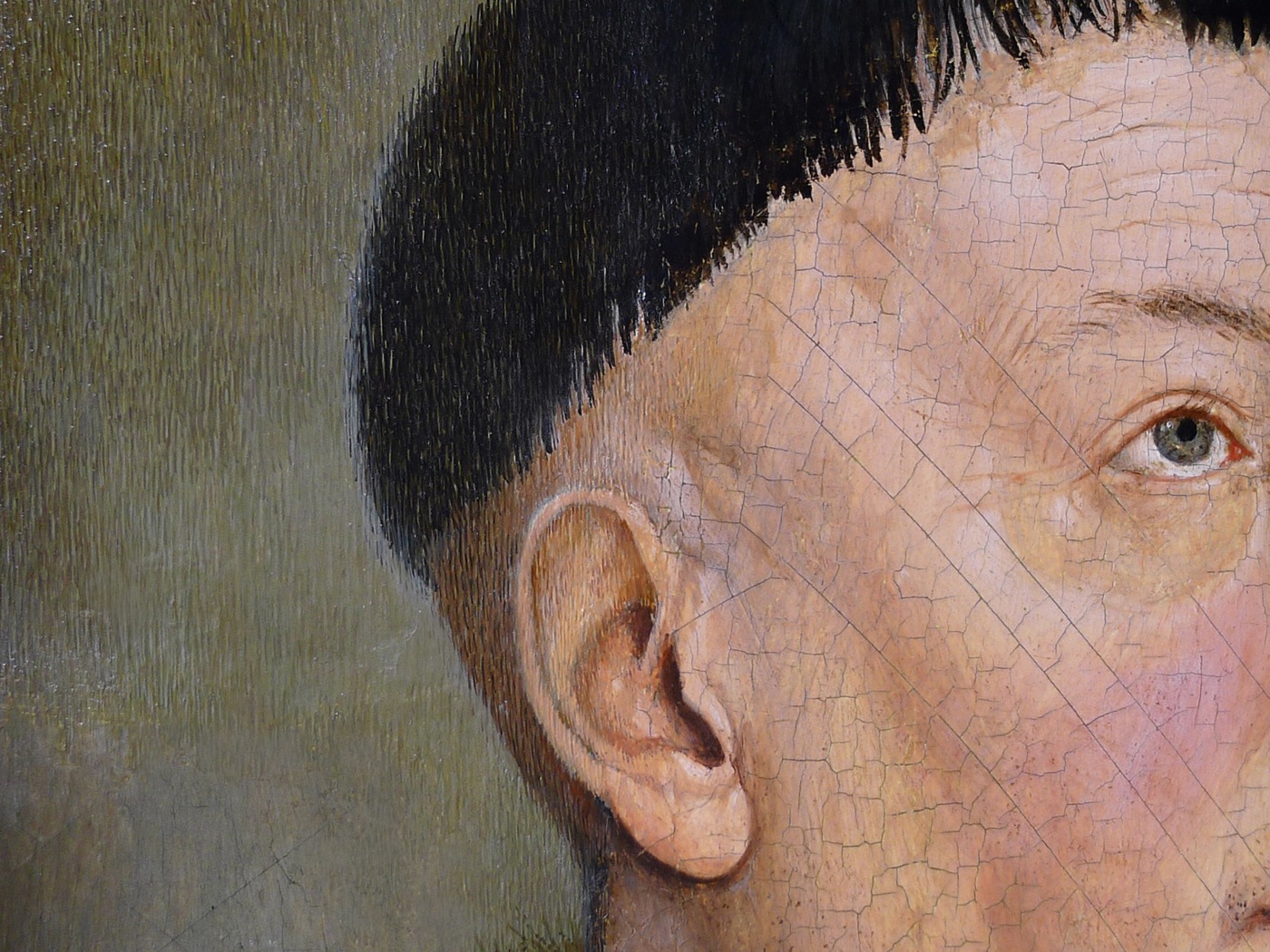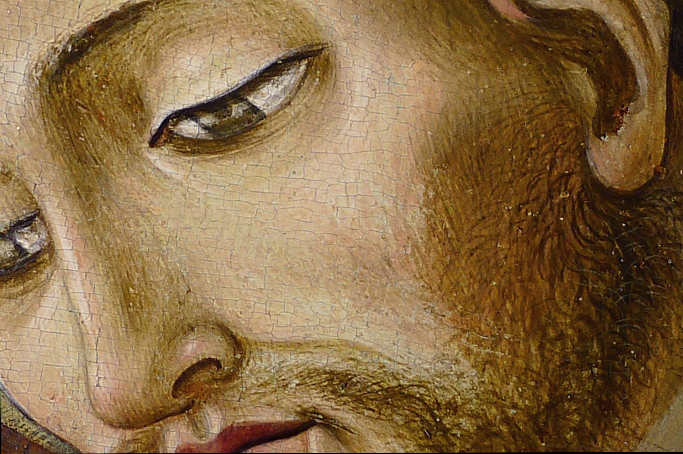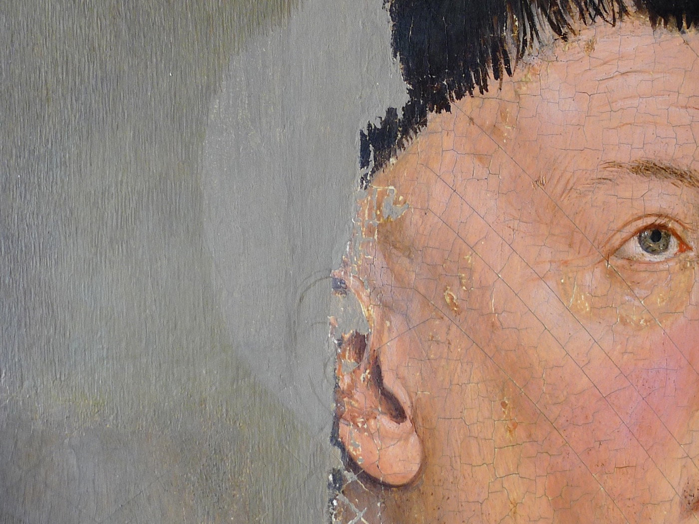 Der Schaden hier ist eine dachförmig aufgestellte Bildschicht. Für das Phänomen ist das Schrumpfen, ein Klimaschaden an der hölzernen Bildtafel, ursächlich. Mit Hilfe von Wärme und einer geeigneten Klebelösung wird die originale Substanz gerettet und wieder befestigt.