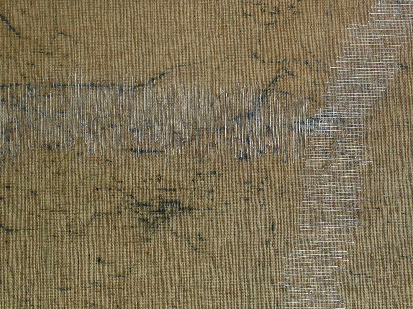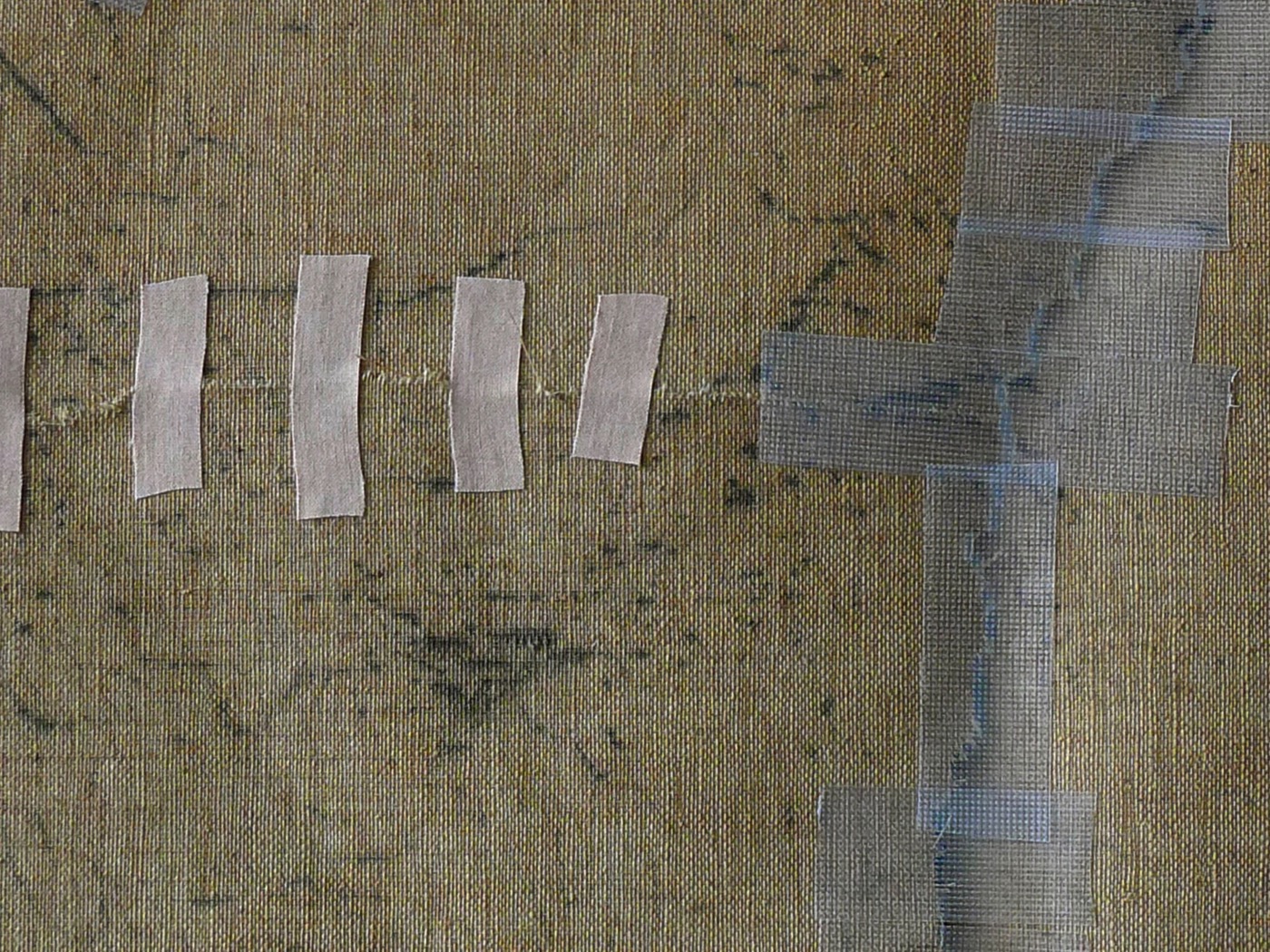 Großer verzweigter Riss (Gemälderückseite) mit vorgefundener Notsicherung. Die Rissverklebung wird Faden für Faden durchgeführt und hier zusätzlich mit aufgeklebten Fadenbrücken stabilisiert. Mit Hilfe der partiellen, rückseitigen Stabilisierung kann der Riss nachhaltig in der Ebene gehalten werden.