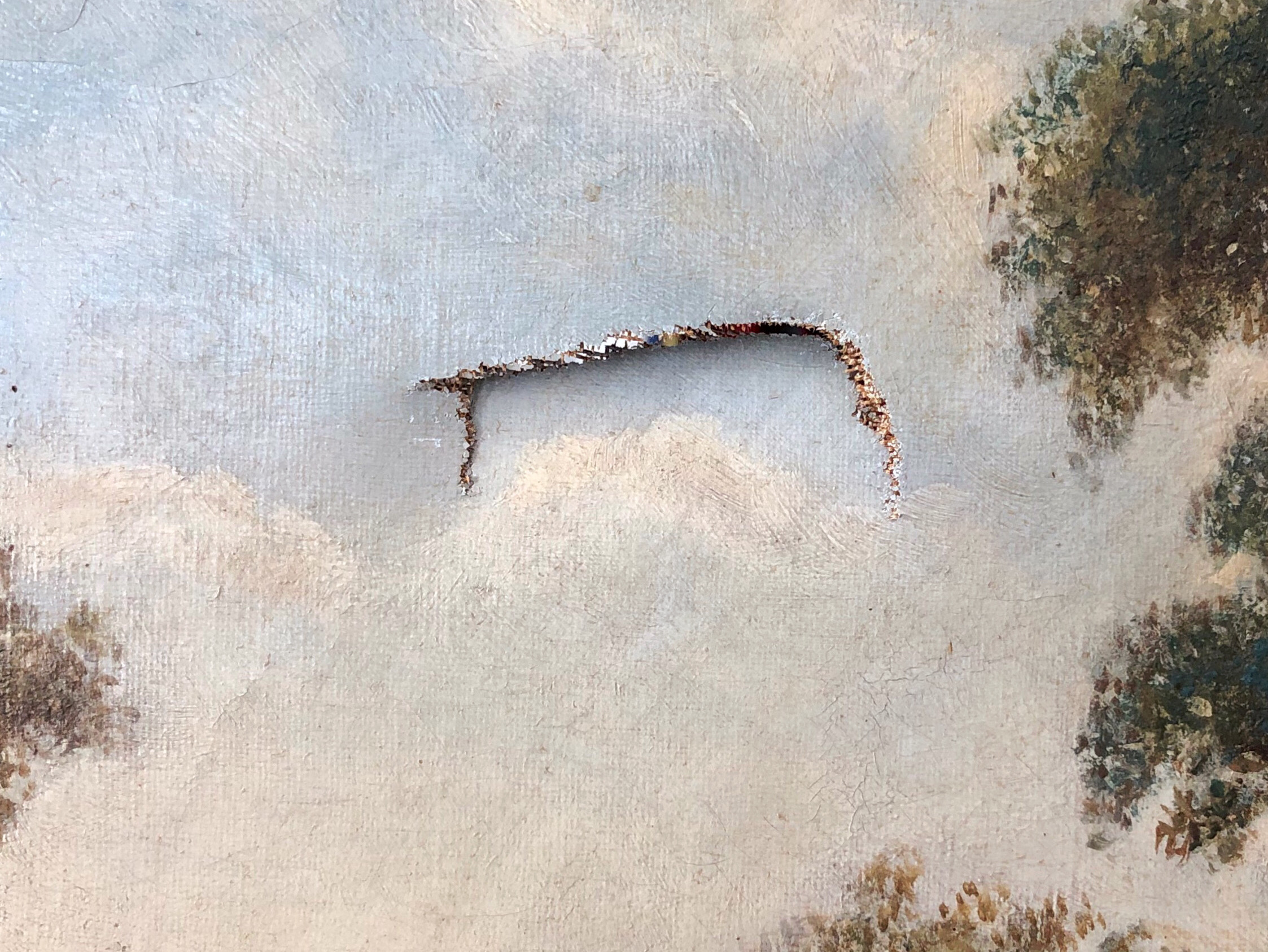 Ein recht spitzer Gegenstand hat das Gemälde getroffen und die Leinwand partiell stark verdehnt. Vor und nach der Beseitigung der Deformation